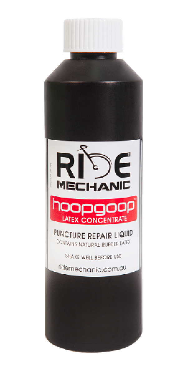 Hoop Goop latex concentrate for tubeless tyre puncture repair: Seals holes in tubeless tyres. Latex concentrate formulation made in Australia; Fresh sealant is the best sealant – remove and replace regularly. Remove and replace before important event. 235ml pack size. Only 60ml of fresh Hoop Goop is required for a 29 tyre in a race.